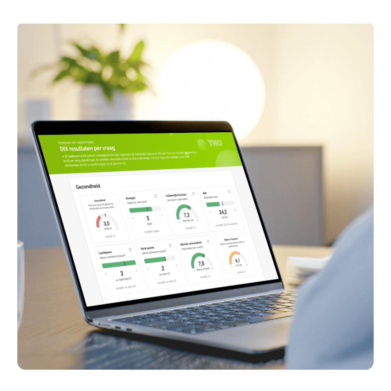 Met de DIX-360 scan van TNO meten we alle risico’s op verminderde inzetbaarheid en roze verzuim in je organsiatie. Mededewerkers vullen deze digitale vragenlijst eenvoudig in via een persoonlijke toeganslink (volledig AVG-proof en anoniem).